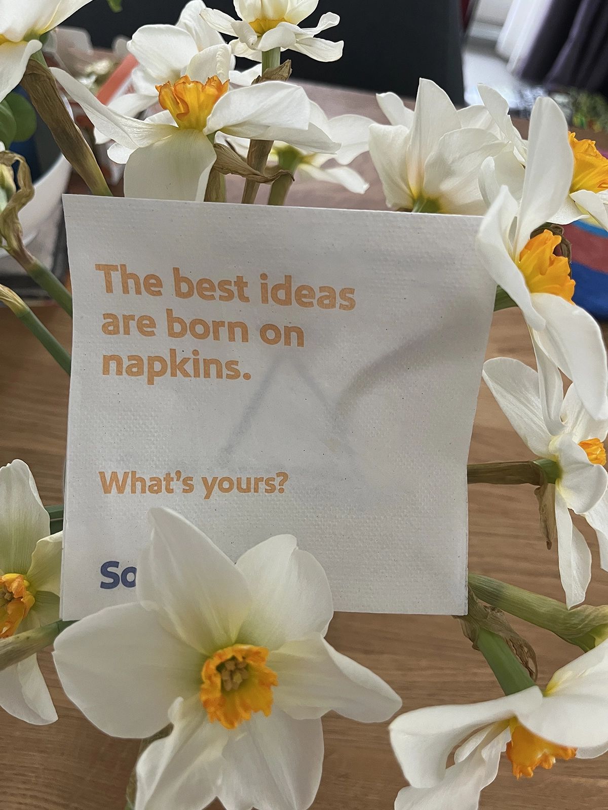 I have a napkin from Southwest Airlines (whose business idea was actually born on a napkin): “The best ideas are born on napkins. What’s yours?”